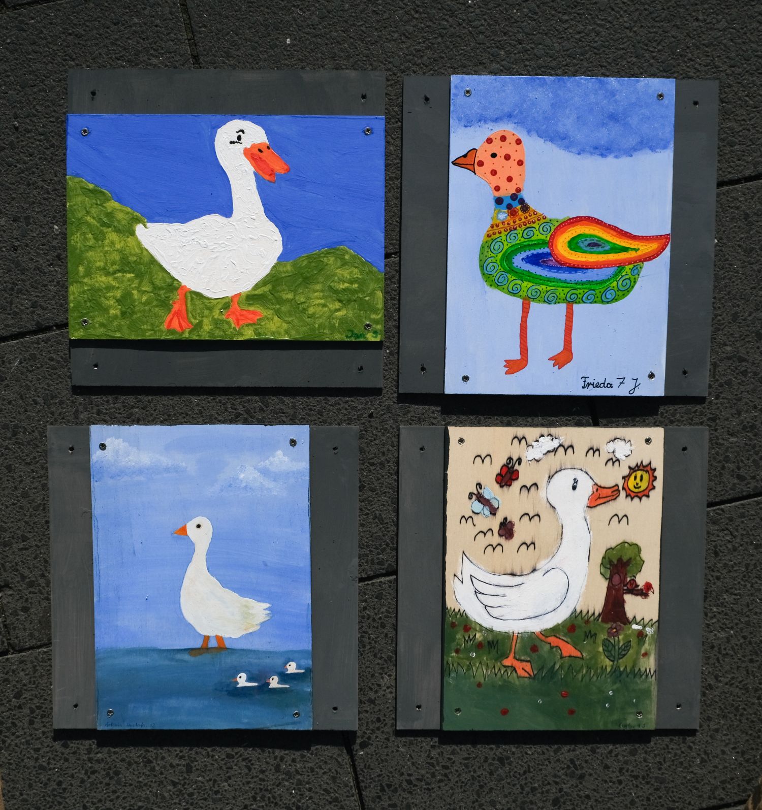 Während des Corona-Shutdowns wurden Kunstpakete an 108 Schüler*innen geschickt. Die waren bestückt mit Acrylfarben, Pinsel, Stift und einer kleinen Holztafel. Außerdem gab es einen Text mit der Idee, eine Ausstellung mit Gans-Bildern zu realisieren. Nadja Pidan, Leiterin der Kunstschule, war wichtig, auf ein Ziel hinzuarbeiten und den Kindern ein Thema anzubieten. Schließlich sind fast 70 Bilder zusammengekommen. „Ein tolles Ergebnis, irgendwie auch unerwartet. Aber alle einzigartig und besonders“ freut sich Nadja Pidan.